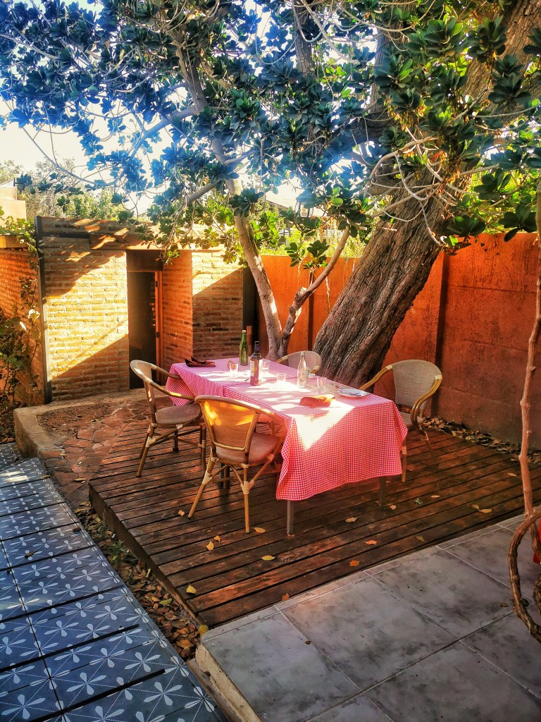 Este almuerzo fue una grata e inesperada sorpresa, ya que antes de viajar a Chile había preparado una lista de los restaurantes donde quería comer en Santiago; y terminé disfrutando de la mejor experiencia gastronómica de mi viaje en esta mesa rodeada de arbustos, donde los rayos del sol jugaban entre las hojas iluminando los platos deliciosos que fueron apareciendo sobre el mantel cuadriculado (por supuesto); platos que fueron explicados minuciosamente por Juan, incluyendo la historia y el lugar de origen de cada ingrediente; fue degustar entero allí en esa mesa el Valle de Limarí con vinos y todo.