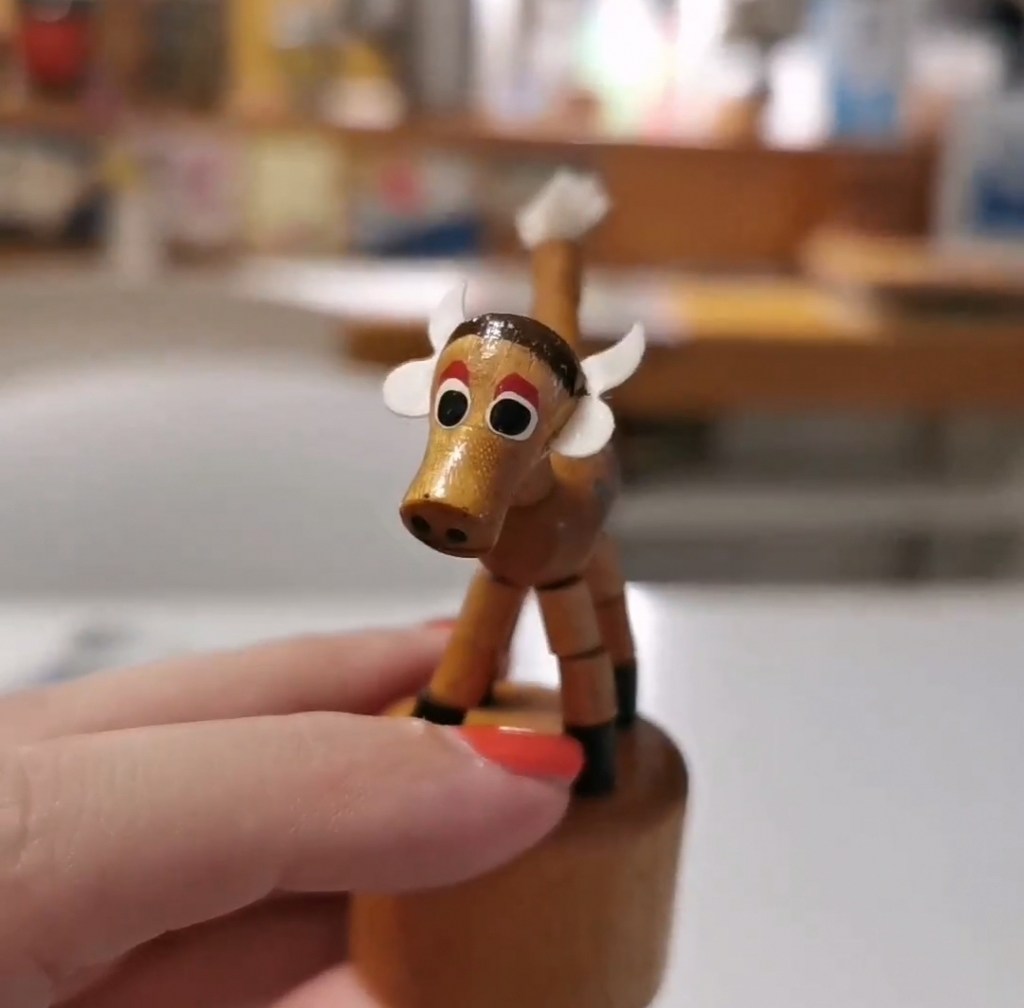 Me senté pues a tomar mi té oolong que tenía un aroma delicioso y delicado a flores blancas, comerme el respectivo Dorayaki y conversar con Caro y Felipe en la mesa de siempre. Jana Bi está habitado por objetos muy lindos, me puse a jugar con uno de ellos, es un caballito de madera que se mueve y bailotea cuando lo aprietas por debajo, un juguetico de madera bien bonito de otras épocas de los juguetes, a mí me gustaban mucho cuando estaba chiquita ese tipo de juguetes, recuerdo que los hacían de varios animales, creo recordar una versión de jirafa de mi infancia, que no sé si era mía y de alguna prima. Le dije a Caro que tendríamos que ponerle nombre al caballo.