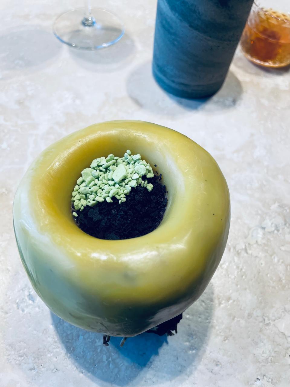 Así me lo imagino recorriendo las aguas del río Amazonas, el río más largo y caudaloso del mundo, rodeado de la selva tropical, nuestro gran pulmón planetario. Un ecosistema que comparte con especies como las míticas e incomprendidas pirañas, fundamentales para el equilibrio natural como grandes carroñeras y limpiadoras del río, y que también forman parte de este paso del menú junto con la amada yuca. Este maridaje fue uno de mis favoritos: un cóctel de copoazú, caña Mater, miel amazónica y aceite de vainilla pompona gigante, plantada por una comunidad de mujeres Awajún en el Amazonas.